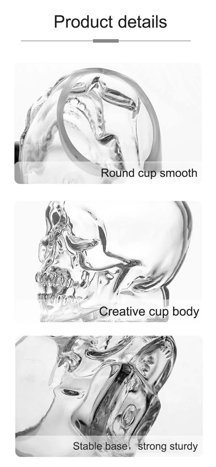 Product Category: Skull Head Glass Style: European Function: high temperature resistance Applicable places: home, bar Pattern: Skull Shape: Irregular Packing specification: single Product capacity: 80ml/150ml/350ml