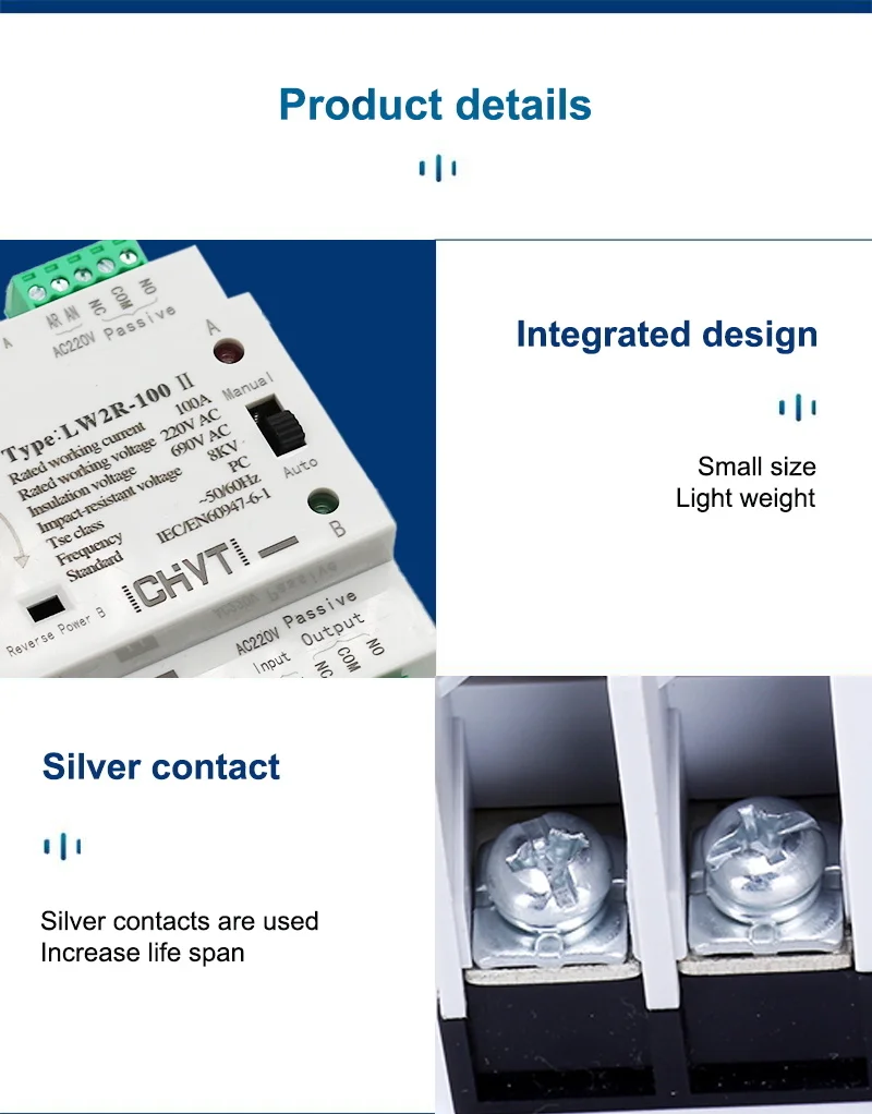 Автоматический переключатель передачи серии W2R подходит для аварийной системы питания с переменным током 50 или 60 Гц номинальным 400 В, 100 А. Он компактен в конструкции, надежен в переноске, удобен в установке и обслуживании и имеет длительный срок службы. Широко используется в различных случаях, когда непрерывный сбой питания не допускается, он может работать как электрически, так и вручную.