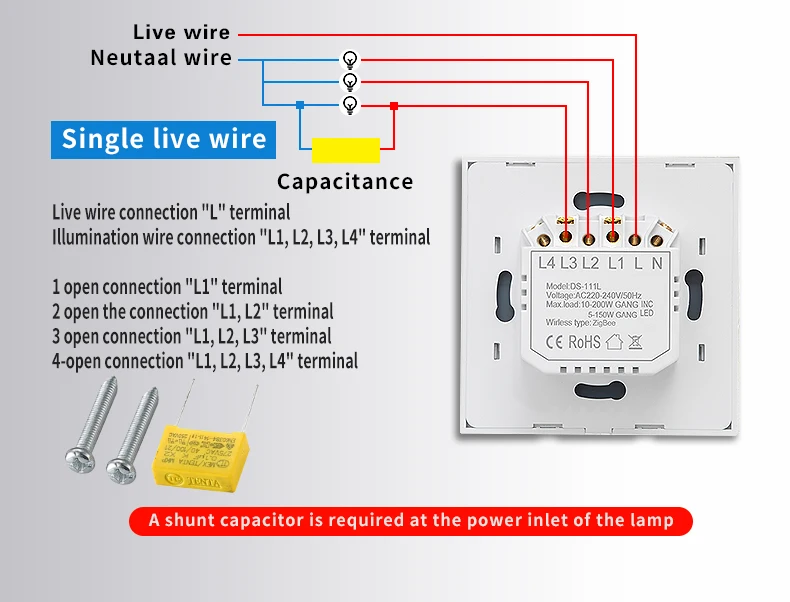 2: продукт имеет два способа установки, нейтральный провод и одножильный провод установки, и одиночный провод установки требует дополнительных конденсаторов