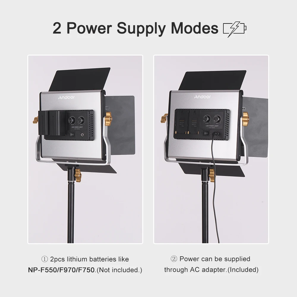 【 2 типа источника питания 】:Питание может подаваться через адаптер переменного тока или 2 литиевых аккумулятора при видеосъемке для использования, поддержка литий-ионных батарей NP-F550/F970/F750. (Батарейки в комплект не входят.)