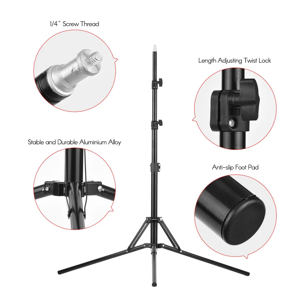 【 U-образный кронштейн и регулируемое освещение 】:U-образный кронштейн позволяет фотографам регулировать угол освещения в зависимости от условий съемки. Поставляется с расширяемой легкой подставкой, высота в сложенном виде составляет около 49,5 см/19,5 дюйма и Макс. Высота около 200 см, с ручкой для блокировки желаемой высоты, очень удобно в использовании.