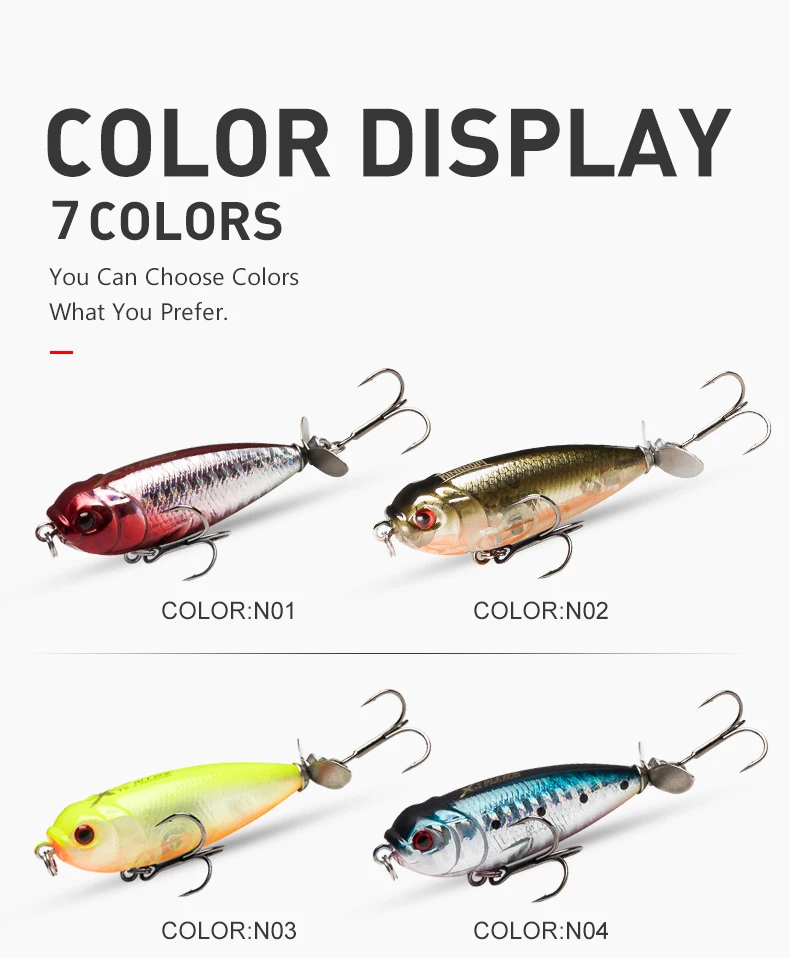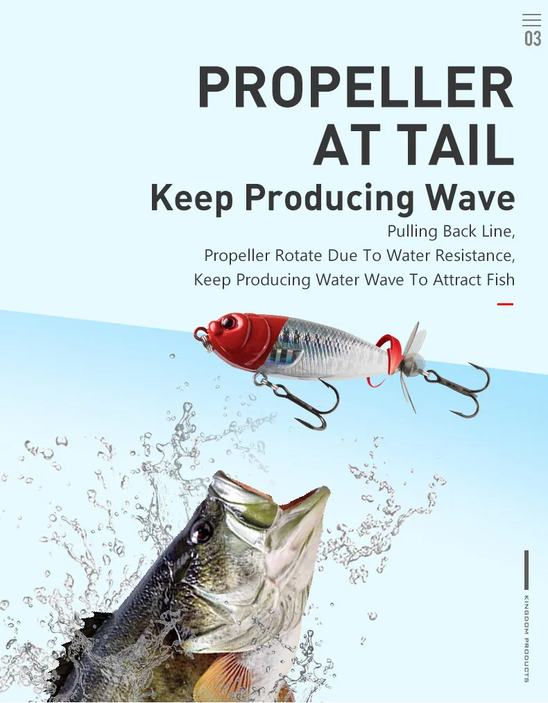 Эта приманка имеет металлический пропеллер на хвосте, который может сделать водную волну, когда она плавает, чтобы максимизировать способность притягивать рыбу.