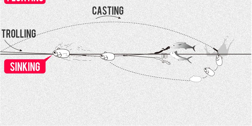 1. Размер и действие: 70 мм/30 г плавающий; 70 мм/50 г погружной; 90 мм/75 г плавающий; 90 мм/90 г погружной