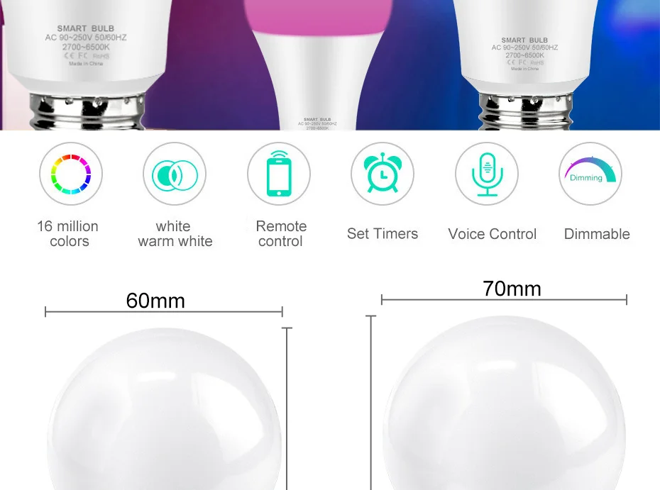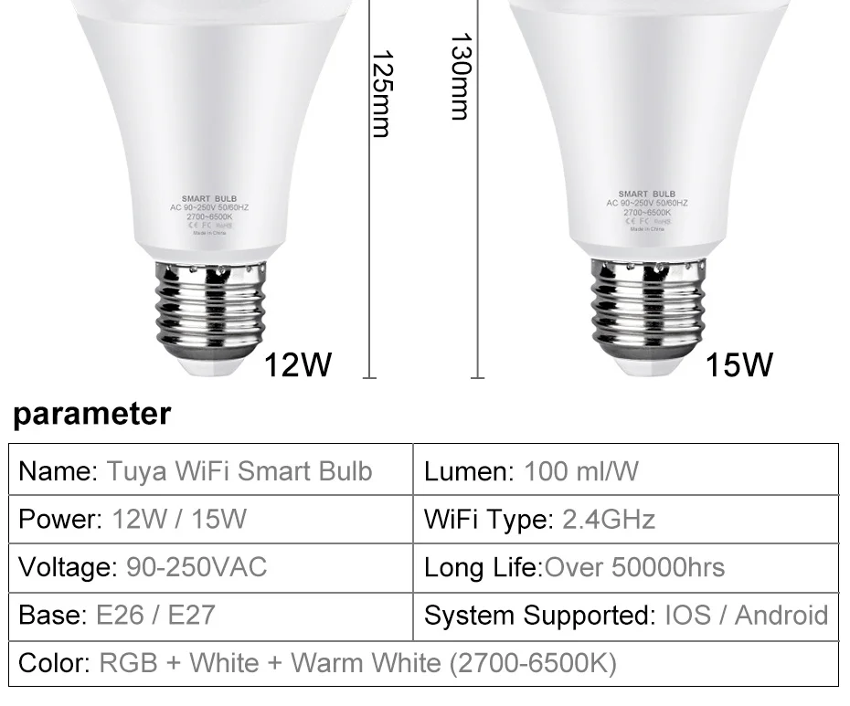 Спецификация: Тип:ТуяWiFi смарт-светодиодный светильник Материал: авиационный алюминий, пластик Цвет изделия: белый Функция:Голосовое управление, дистанционное управление с помощью приложения, регулировка яркости,Совместимость с Amazon Alexa Echo Google Home Assistant, IFTTT Светильник: RGB + теплый белый + белый (2800К-6500K) Тип разъема: E14 Мощность: 5 Вт Напряжение: переменный ток90-250V Чип: светодиодный SMD 2835 CRI: >85 Люмен: 100 лм/Вт Срок службы: >50000 ч Угол луча: 270 градусов Размер:4.*11См/1,5* 4.3 дюйма(Д * В) Вес нетто:40G/1.. 4 унции Загрузка приложения:Умная жизнь Сеть:2,4 ГГц Wi-Fi Совместимость с голосовым управлением:ВУмная лампа работает с Alexa Echo, Google Home Assistant, вы можете управлять умной лампой через ваш голос, И просто нужно дать голосовую команду, чтобы включить/выключить или затемнить/осветить ваш светильник (Е. g. "Alexa, установите спальню на синий") Пульт дистанционного управления:Включение/выключение Siri ,Alexa, google home включило умную лампу, независимо от того, находитесь ли вы дома или далеко. Вам просто нужно загрузить приложение «Умная жизнь». Вы можете создать группу для всех ваших умных ламп и управлять ими с помощью только одной команды. RGBCW и многоцветная умная лампа:RGB холодный белый и теплый белый смарт-лампа создает ваши любимые эффекты светильник с 16 миллионов цветов и яркость каждого цвета с регулируемой яркостью Широкое применение и система сцены:Вы можете установить различные режимы на умный светильник, чтобы соответствовать различным поводам, включая кухню, гостиную, спальню. Умная лампа peteme также может использоваться для настольной лампы, кафе, бара, вечерние и т. д. У этой функции есть цветовая палитра, управление группой, солнечный светильник, таймер, восход, закат, диммируемая яркость, Функция микрофона, DIY режим, режим сцены, энергосбережение... Энергосбережение и срок службы:15 Вт 1500лм умная лампа с базой E26/E27, эквивалентной 100 Вт традиционным лампам накаливания. Экономит до 80% энергии, дольше и экономит энергию. Как подключиться к приложению smart life?: 1.ЗагрузитеУмная жизньПриложение, зарегистрируйте учетную запись и Войдите в систему 2.Нажмите «+» в правом верхнем углу-все устройства-осветительные приборы 3.TUrn on the switch 3 раза: on-off-on до тех пор, пока он не вспыхнет быстро 4.Нажмите «Подтвердить светильник быстро мигает ", а затем введите правильный пароль Wi-Fi (2,4 ГГц Wi-Fi) 5.В течение 30 секунд, он будет подключен