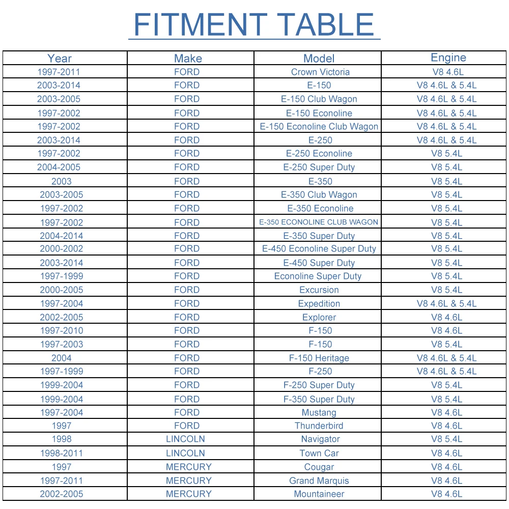 1998 ~ 2011 Crown Victoria 4.6L V8 2003 E-450 сверхмощное Полосатое шасси 5.4L V8 & 6.8L V10 2003 E-550 Super Duty 6.8L V10 2004 F-150 Heritage 4.6L V8 1997 ~ 1999 Econoline Super Duty 5.4L V8 & 6.8L V10 2000 ~ 2005 экскурсия 5.4L V8 & 6.8L V10 2000 ~ 2004 экспедиция 4.6L V8 & 5.4L V8 2002 ~ 2005 Explorer 4.6L V8 2003 E-350 5.4L V8 & 6.8L V10 1999 ~ 2004 Mustang 4.6L V8 SOHC 2003 ~ 2011 E-150 л V8 и 2003 л V8 2005 ~ E-150 1999 Club Wagon 2002 л V8 E-150 ~ 1997 2002 Econoline 2000 л V8 и 2002 ~ E-150 л V8 ~ Econoline Club Wagon л v8 и 5.4L V8 2003 ~ 2009 E-250 1997 lv8 и 5.4L V8 2002 ~ E-250 2003 Econoline 5.4L V8 2005 ~ E-250 2003 Super Duty 5.4L V8 2005 ~ E-350 1997 Club Wagon 5.4L V8 и 6.8L V10 ~ 2002 E-350 Econoline 5.4L V8 & 6.8L V10 2004 ~ 2009 E-350 Super Duty 5.4L V8 & 6.8L V10 2000 ~ 2002 E-450 Econoline Super Duty 5.4L V8 & 6.8L V10and полосатый 5.4L V8 & 6.8L V10 2003 ~ 2009 E-450 Super Duty 5.4L V8 & 6.8L V10 1997 ~ 2003 f-150 2000 л V8 2009 ~ F-150 1997 л V8 1999 ~ F-250 1999 2004 л V8 F-250 ~ 1999 2004 Super Duty F-350 л V8 и 1999 л V10 2004 ~ F-350 Super Duty л V8 ~ и F450 И F550 Super Duty 6.8L V10
