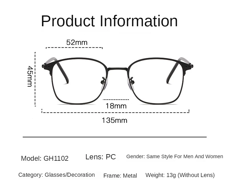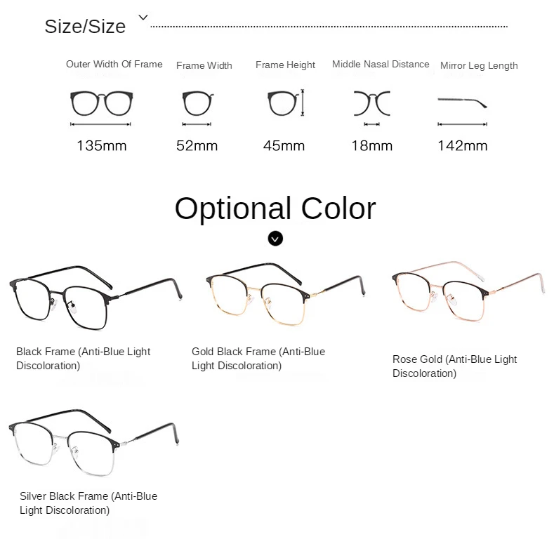 Название продукта: анти-синий светильник для обесцвечивания очков Материал: Поликарбонат Материал оправы: металл Общая ширина оправы: около 135 мм Ширина оправы: около 52 мм Расстояние между носами: около 18 мм Высота оправы: около 45 мм Длина дужек: около 142 мм Вес: около 13 г (без объектива) Цвет линзы: белый Цвет: черная оправа, анти-синий светильник, Золотая оправа, черный анти-синий светильник, серебряная оправа, черный анти-синий светильник, розовое золото точка чая анти-синий светильник, черная оправа, анти-синий светильник DDis color ation, Золотая оправа, черный анти-синий светильник Dis color ation, серебристая оправа, черный анти-синий светильник Dis color ation, розовый Золотой точечный чайный анти-синий светильник Dis color ation Стиль: полная оправа Подходит для лица: маленькое лицо