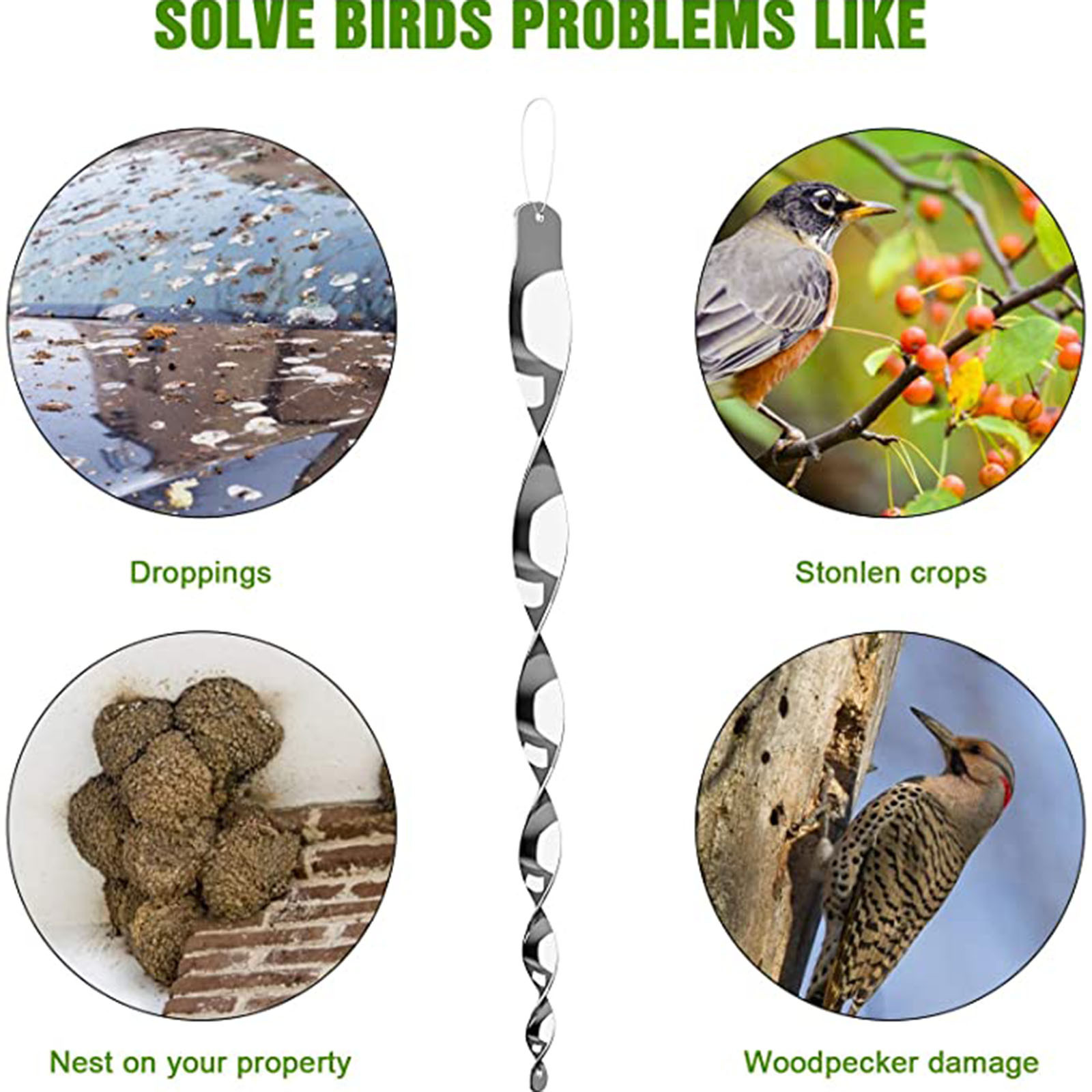 Он имеет две функции устройства защиты от птиц и вращающееся украшение, чтобы украсить ваш окружающий дом и сад. Это очаровательный декоративный кулон.
