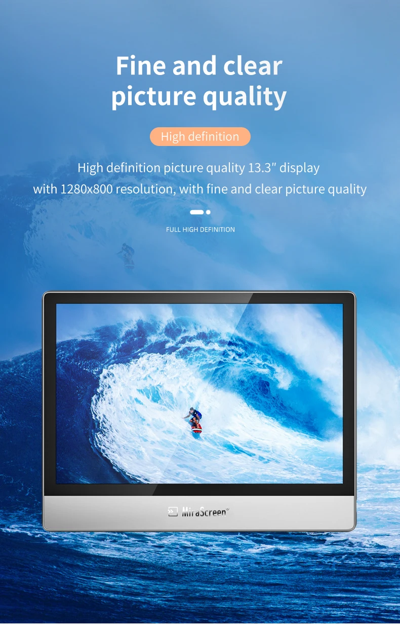 1. Этот Eyoyo 13,3 "Портативный игровой ПК монитор имеет 1280x800 с высоким разрешением, Технология HDR, 178 ° полный угол обзора, 16:9 соотношение сторон, так что вы можете наслаждаться более четкие реалистичные стереоскопическое изображение.
