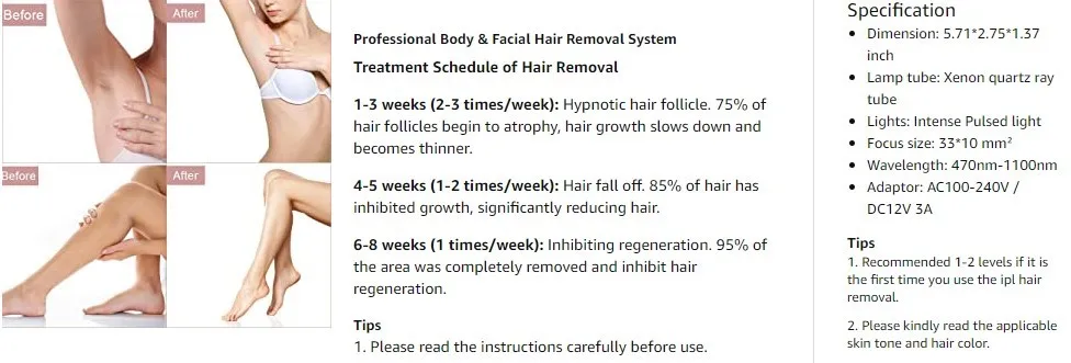 【【Безболезненное и постоянное удаление волосНаша система удаления волос с новейшей технологией IPL является одним из самых эффективных способов нежного, безболезненного и постоянного удаления волос. Это Удаление волос IPL может обеспечить точное лечение меланина волосяного фолликула и значительно замедлить рост волос. Этот светильник для удаления волос более нежный и безболезненный, чем другие лазерные эпиляции.