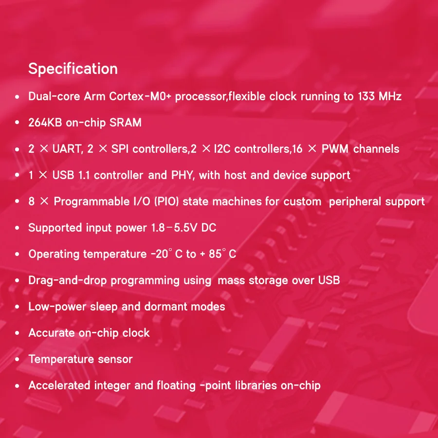Гибкий ввод/вывод подключает RP2040 к физическому миру, позволяя ему говорить практически с любым внешним устройством. Высокая производительность при помощи целых рабочих нагрузок. Низкая стоимость помогает облегчить барьер для входа.