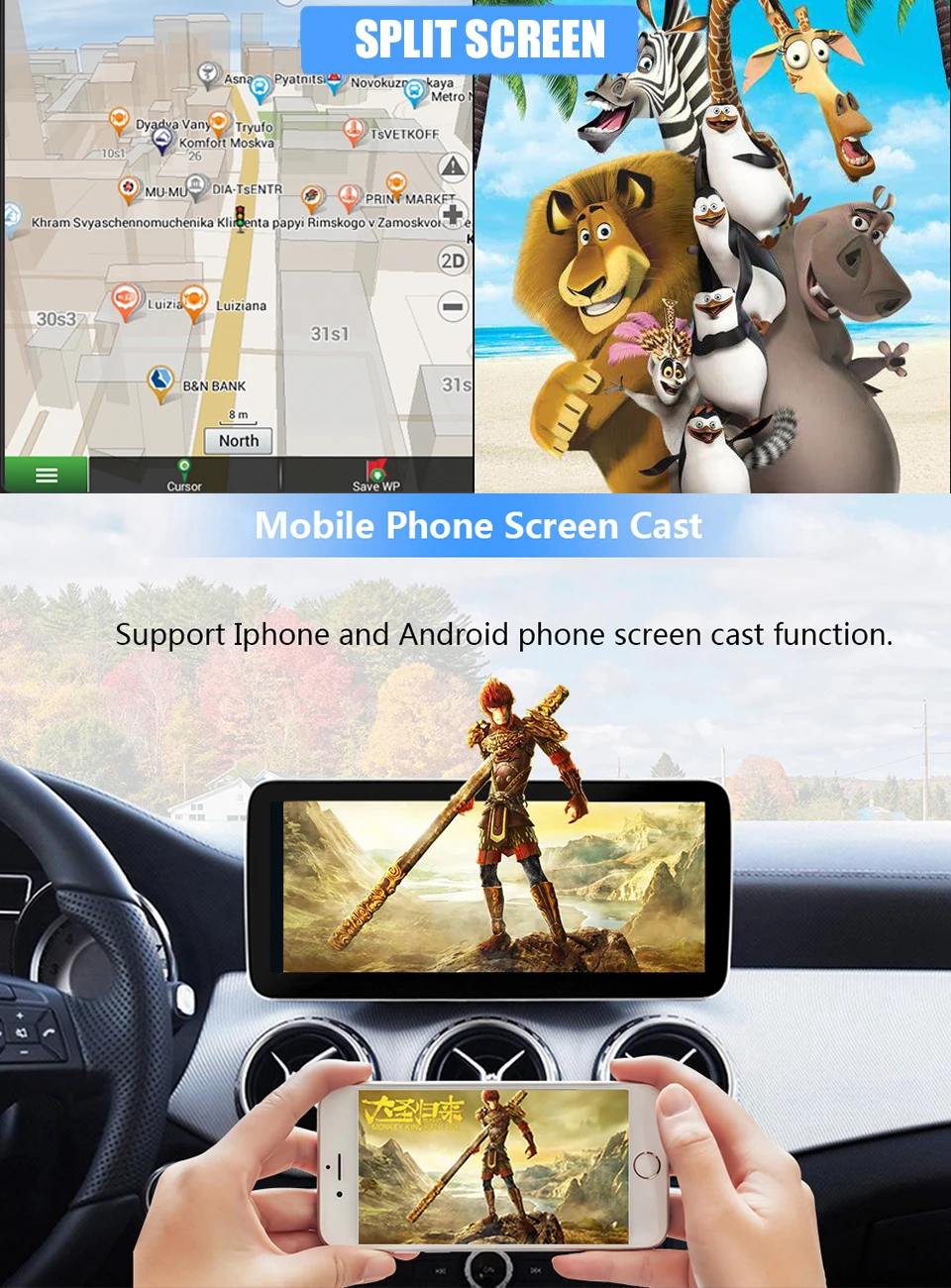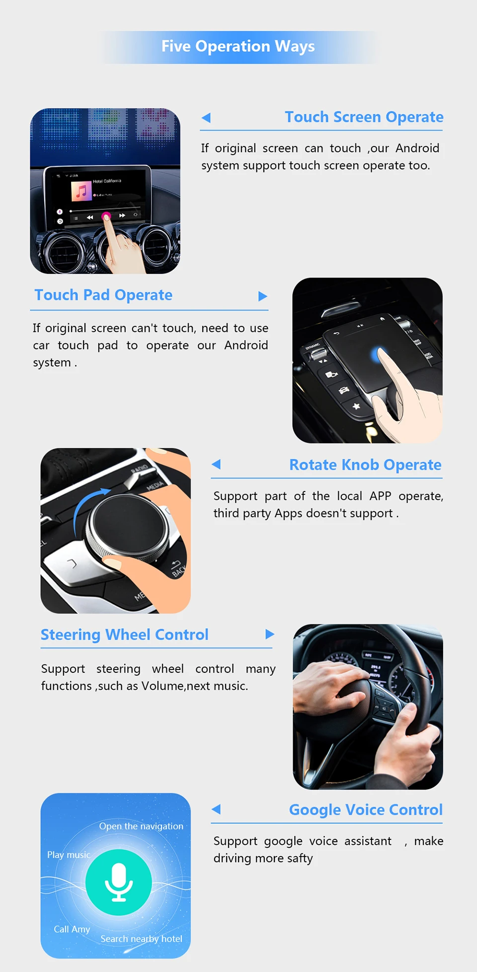 【Сделать вождение более безопасным 】 поддержка сенсорного экрана, сенсорной панели, поворотная ручка управления и рулевого колеса, голосовое управление Google. Вы можете избавиться от телефона в машине. Примечание: Пожалуйста, используйте нашу gps-сигнальную коробку и антенну для навигации, за исключением Audi (не включая Q3), Volvo, Porsche XT5/CT6.