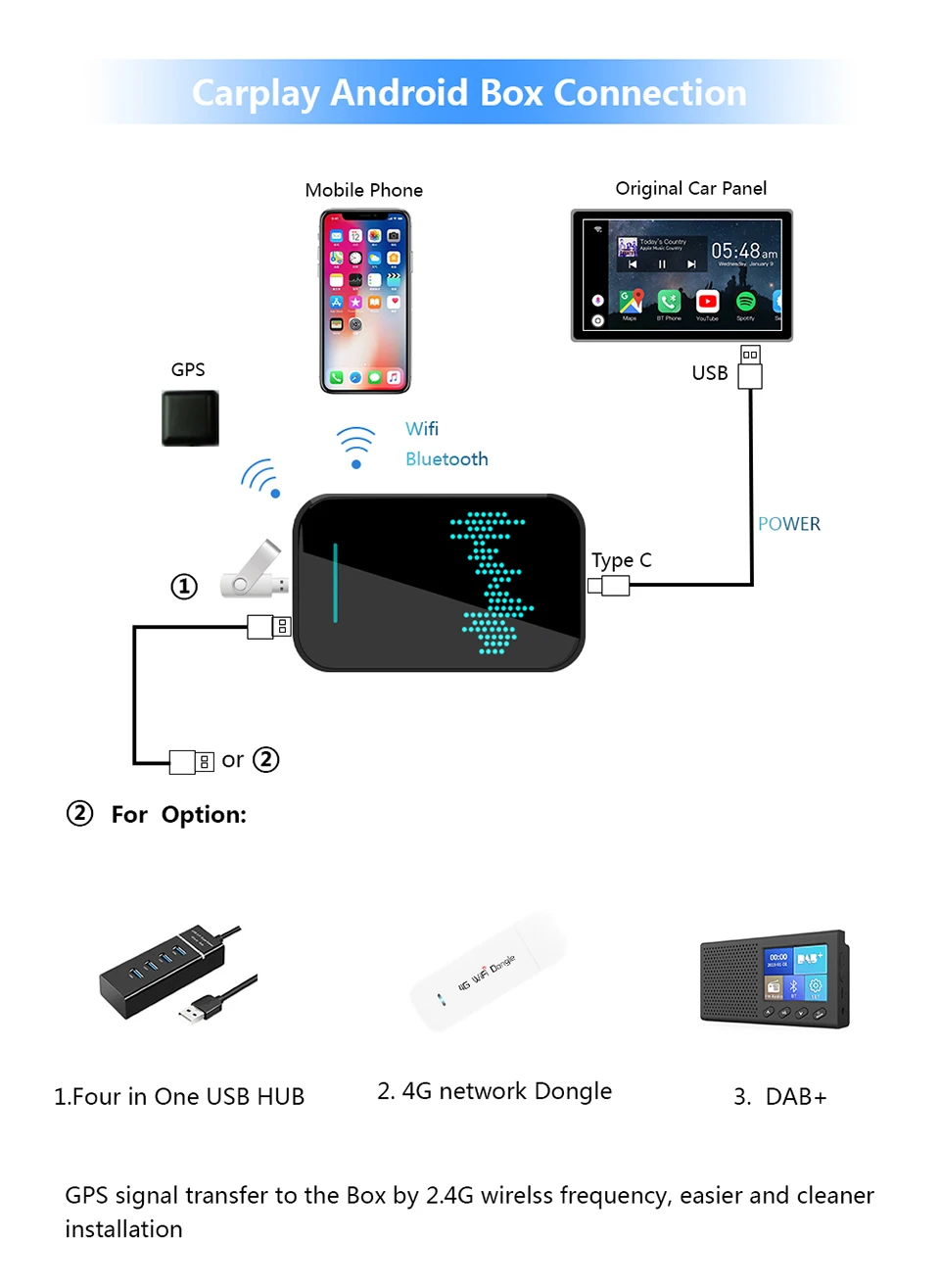 【Легко установить и 】вставьте коробку CarPlay в usb-порт автомобиля, подождите 1-2 мин (устройство инициализируется), выберите «CarPlay» из меню оригинальной автомобильной мультимедийной системы, И тогда он автоматически переключится на нашу систему android. Примечание: Убедитесь, что оригинальное автомобильное радио имеет функцию CarPlay