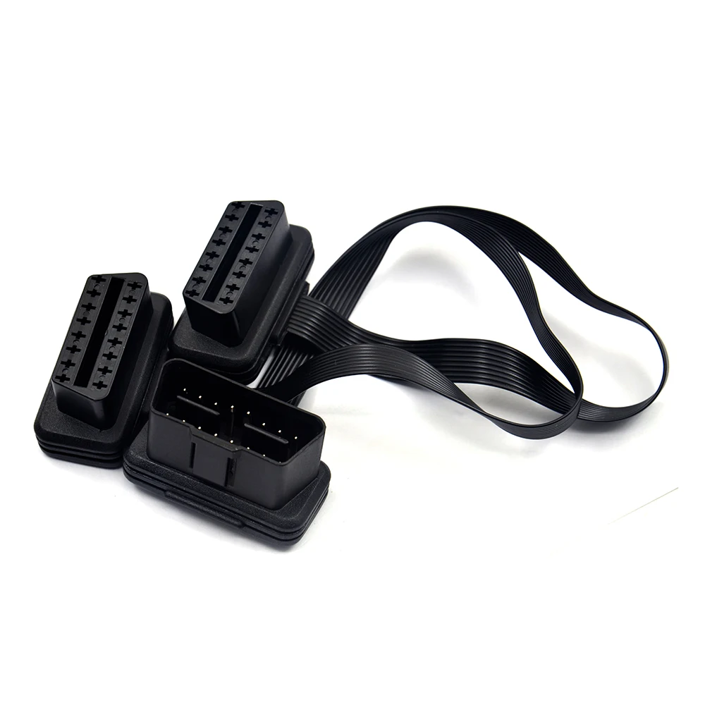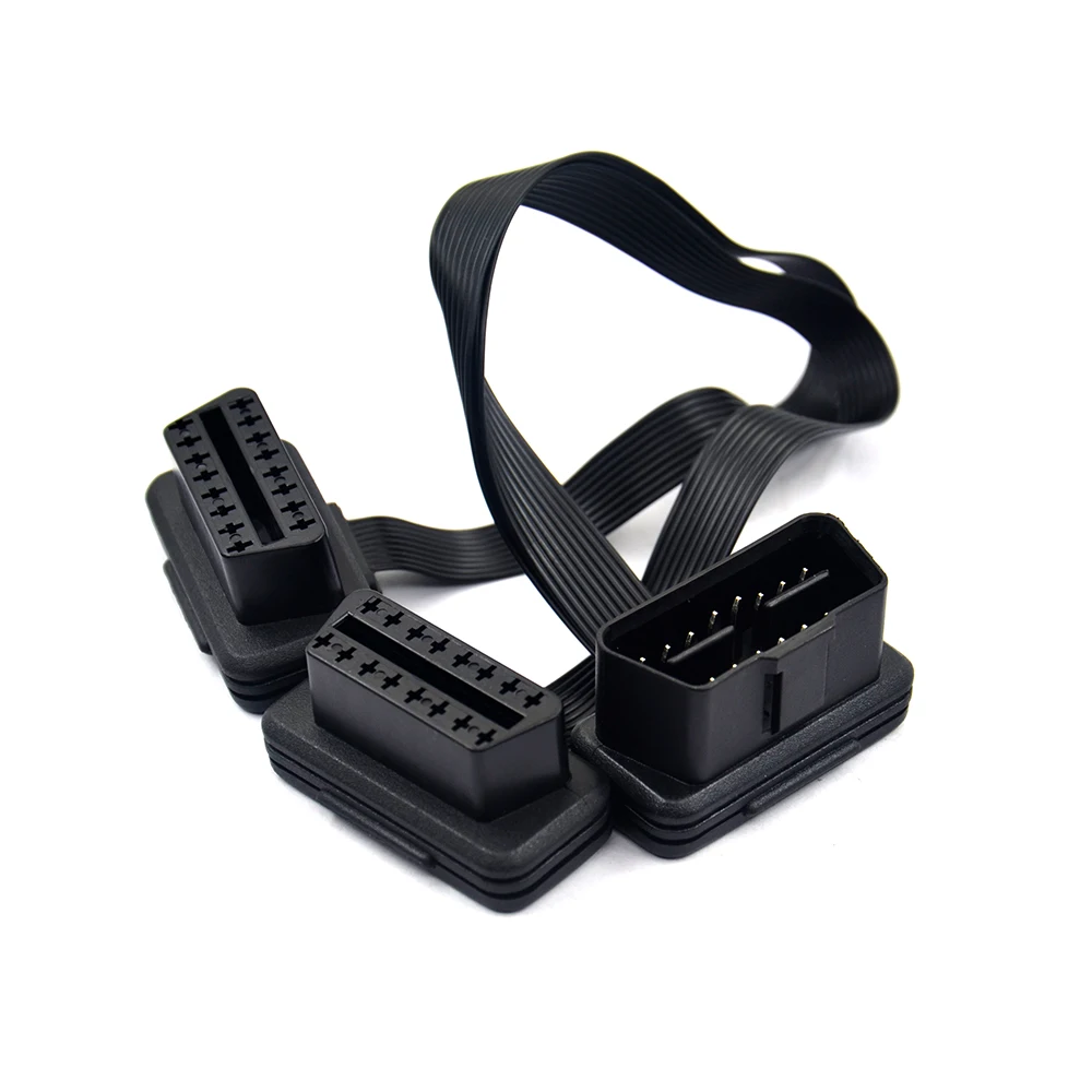 Новейший плоский + тонкий 16 Pin OBD 2 удлинитель OBD2 16 Pin ELM327 Штекерный к двойному гнезду Y сплиттер локоть OBDII удлинитель соединительный кабель