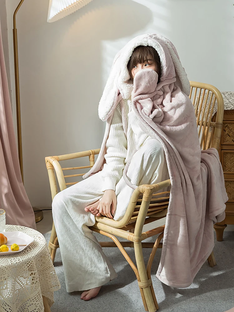 Милое одеяло с кроликом, Коралловое бархатное теплое зимнее одеяло в японском стиле, накидка с капюшоном, одеяло для взрослых детей
