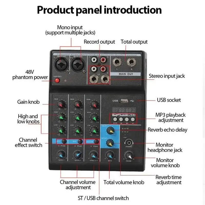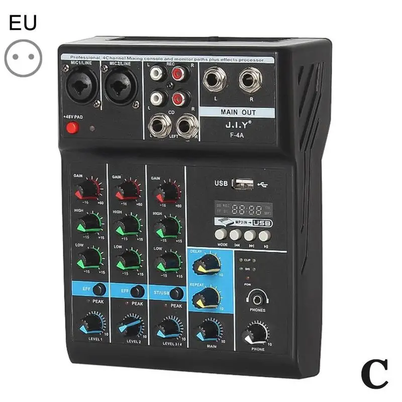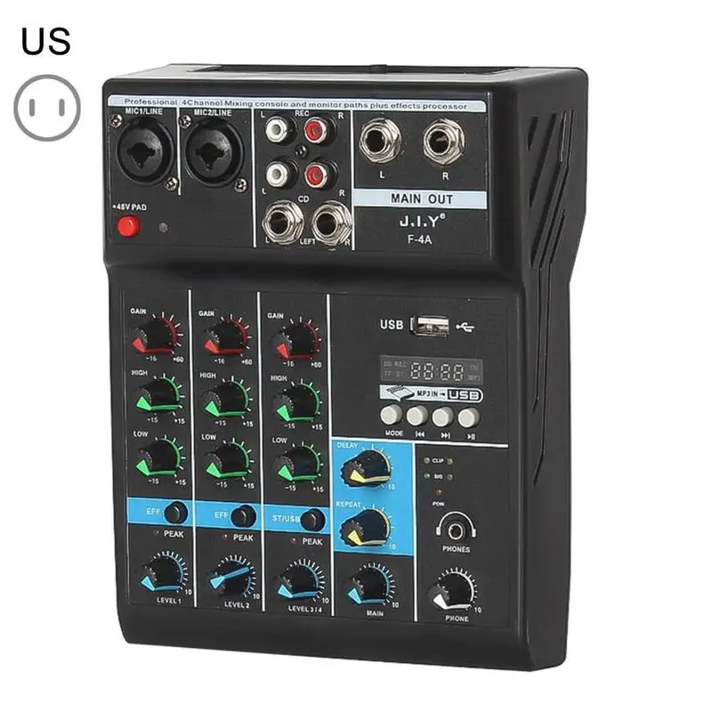 -Миксер оснащен встроенным фантомным источником питания 48 В + для прямого питания конденсаторных микрофонов.