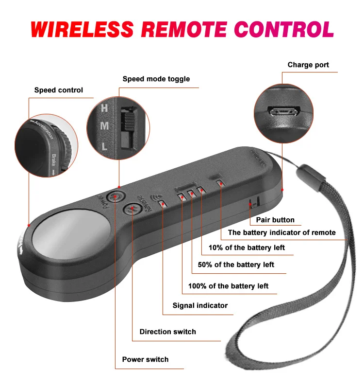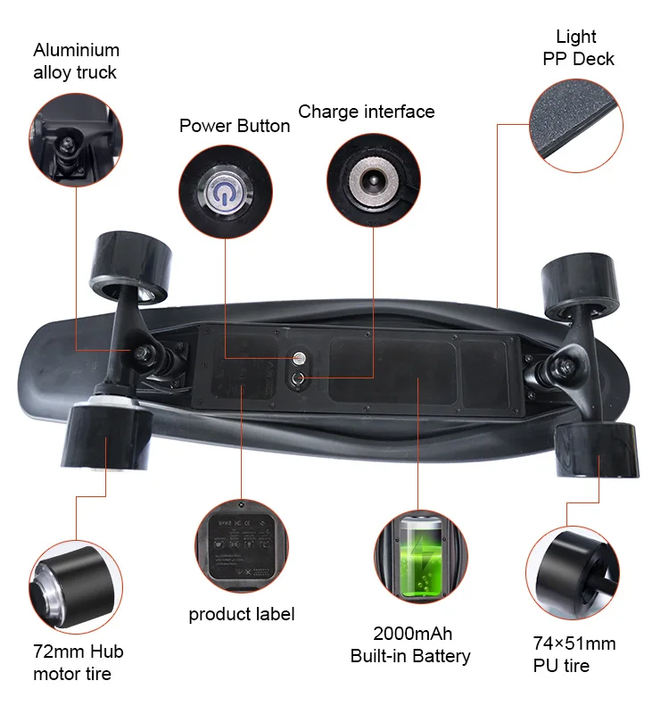 Беспроводной пульт дистанционного управления: интеллектуальный пульт с отличной функцией ускорения или замедления, прямого или торможения и заднего хода. Беспроводной пульт дистанционного управления можно быстро и легко подключить к скейтборду. Вы можете начать свое путешествие сразу же