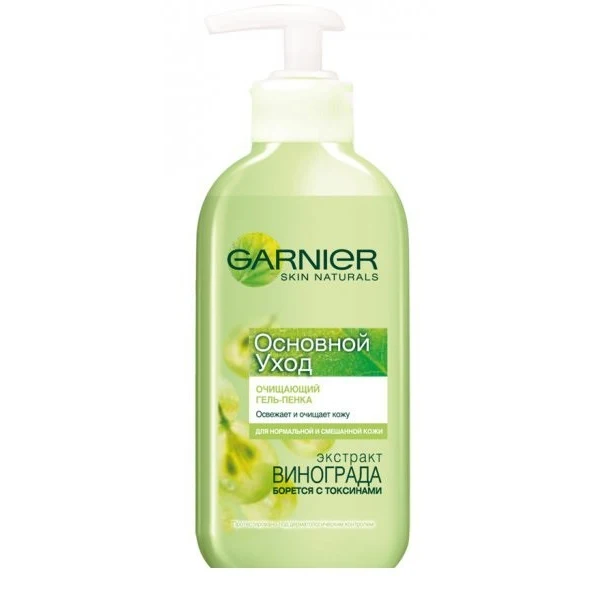 Очищающий гель-пенка для умывания для нормальной и смешанной кожи Garnier Skin Naturals "Основной уход" предназначен для очищения нормальной и смешанной кожи. Оно эффективно и без лишних усилий удаляет загрязнения с поверхности кожи, а содержащийся в его формуле экстракт винограда мягко увлажняет кожу и борется с токсинами.