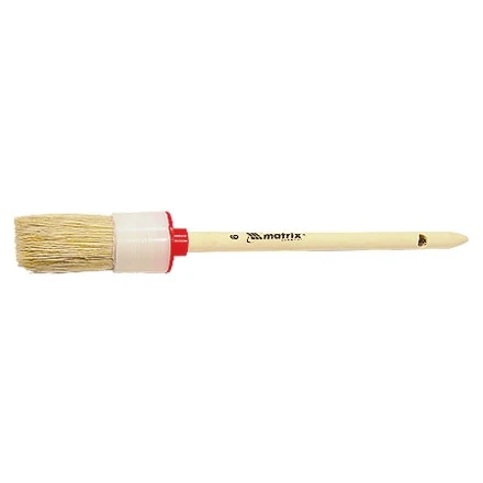 Ворс кисти из натуральной светлой щетины, расщепленной на концах. Диаметр кисти от 20 до 65 мм. Щетина кисти надежно закреплена пластмассовым бандажом. Ручка изготовлена из дерева. Кисть предназначена для работ с масляными красками и лаками, устойчива к агрессивным составам. Применяется для окраски и грунтовки небольших по площади поверхностей.
