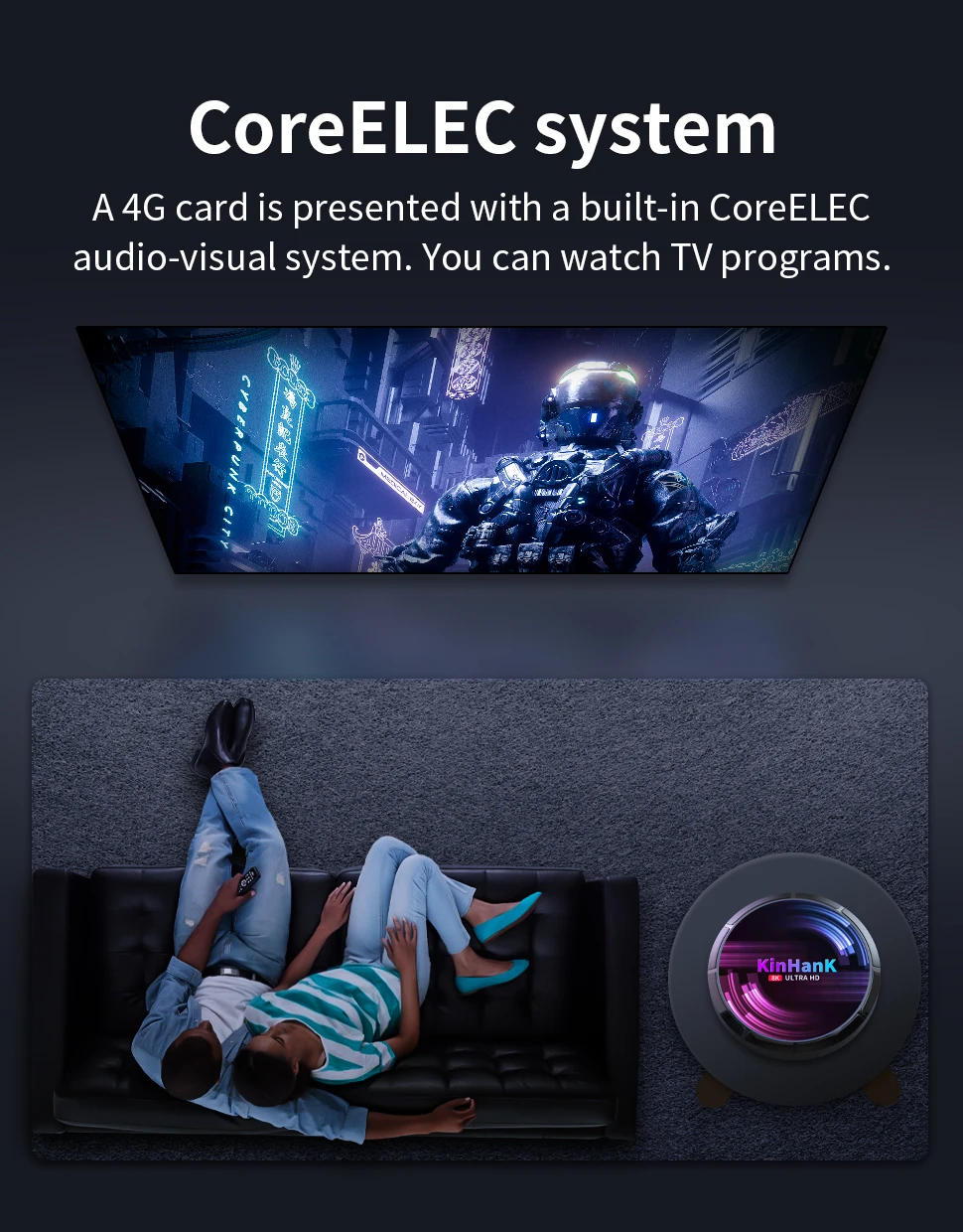 Карта 4G снабжена встроенной аудиовизуальной системой CoreELEC. Вы можете смотреть телевизионные программы в 4K ultra-clear, предоставляя вам отличный опыт просмотра.