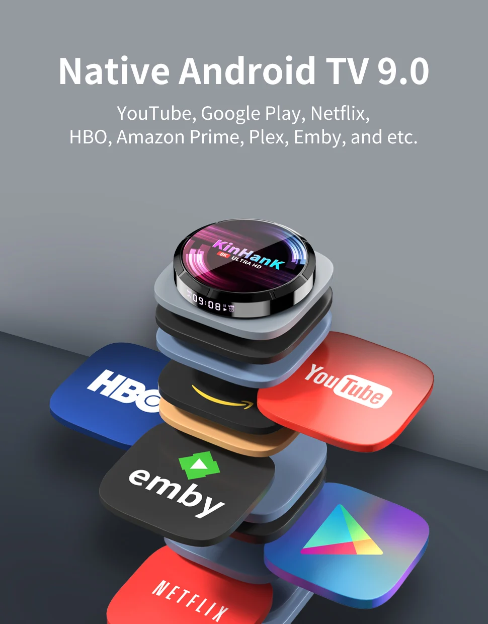 Оригинальный Android TV 9 работает плавно и быстро и совместим с различными программными средствами, такими как YouTube, Google Play, Netflix, HBO, Amazon Prime, Plex, Emby и т. д.