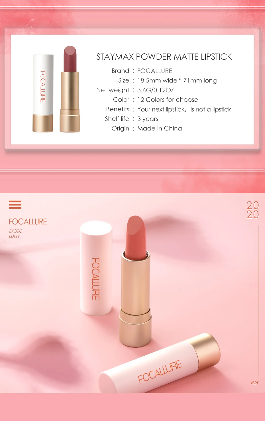 Ваша следующая губная помада-это не губная помада! Матовая губная помада Focallure Staymax создает 12 ярких цветов на ваш выбор. Содержит экстракт камелии и витамин е для питания и увлажнения губ в качестве бальзама. Матовая отделка без фильтра подчеркивает ваш доступ к губам в течение всего дня, оставаясь свежим пигментом, в то время как легкий, как липтинт в дышащей области.