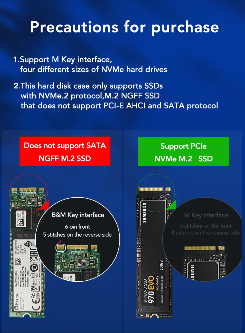 2. Чехол модели NVMe не совместим с NGFF SATA M.2 SSD, наоборот.