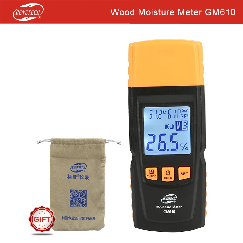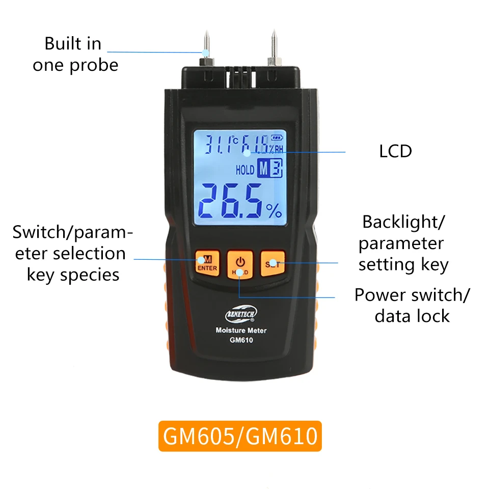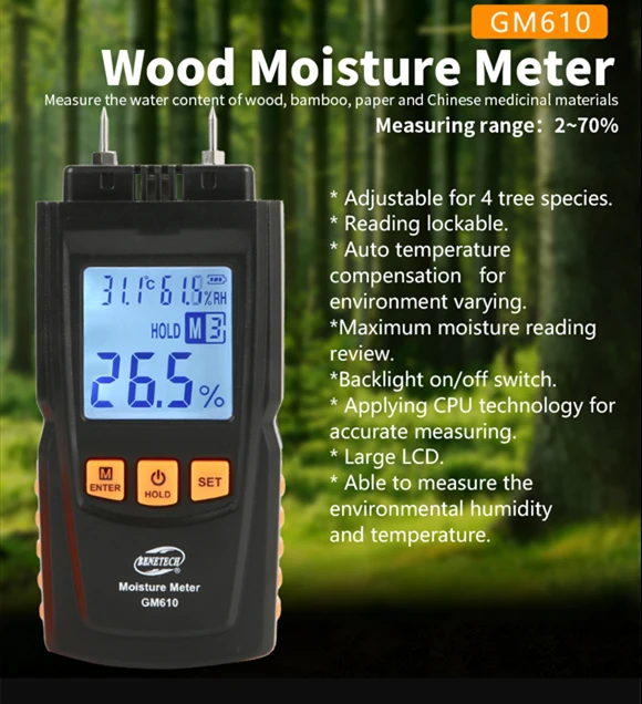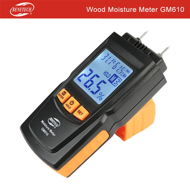 BENETECH GM610 измеритель влажности для дерева 2 контакта тестер влажности детектор влажности древесины гигрометр диапазон 0 ~ 70% цифровой ЖК-дисплей