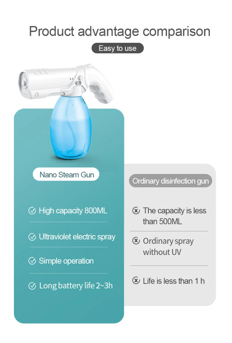 Перезаряжаемая литиевая батарея, она может длиться около 2 ~ 3 ч при полной зарядке, и дезинфекция Более Тщательная