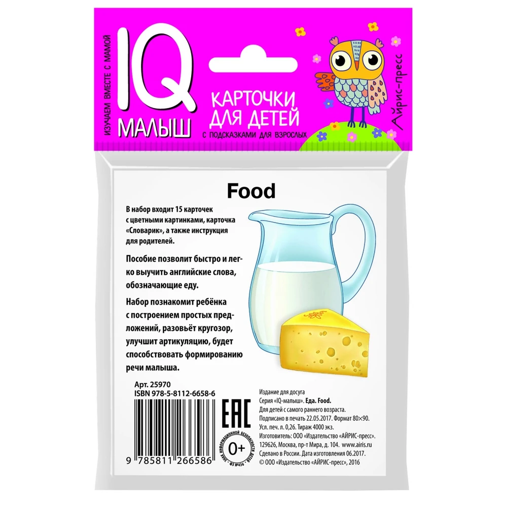Набор «Еда» знакомит ребёнка со словами, обозначающими самые популярные продукты и напитки, помогает расширить словарный запас. В набор входит 15 карточек с цветными картинками, карточка «Словарик» и карточка с инструкцией для родителей. Для детей дошкольного возраста. + 15 карточек с картинками. + Яркая глянцевая печать. + Плотный картон. Для родителей: + Простая инструкция для занятий. + 4 варианта игр для запоминания слов. + Словарик + произношение русскими буквами.