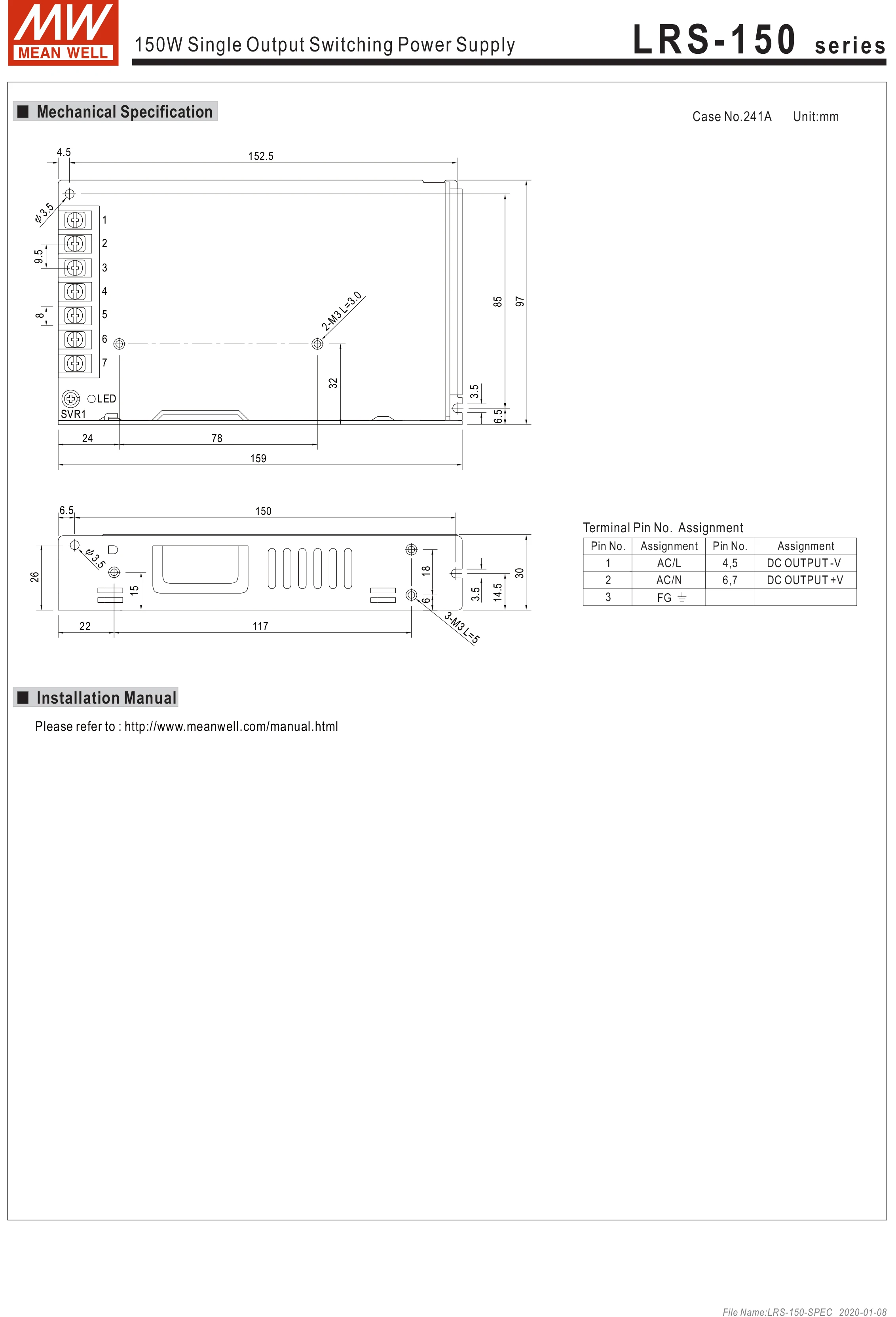 Серия LRS-150-это источник питания с одним выходом 150 Вт с 30 мм низкопрофильной конструкцией. Принимая вход 115VAC или 230VAC (выбирается переключателем), вся серия обеспечивает выходное напряжение lline 12V, 15V,24v,36v и 48v.
