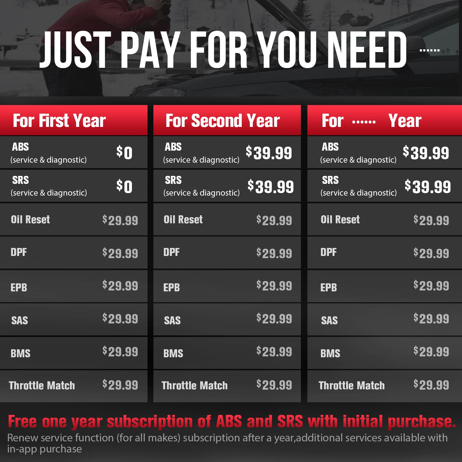5. Оплачивайте только ту услугу, которая вам нужна. Скачать системы ABS и SRS для всех делает бесплатно (обновление подписки на систему через год, дополнительный сервис доступен при покупке в приложении)
