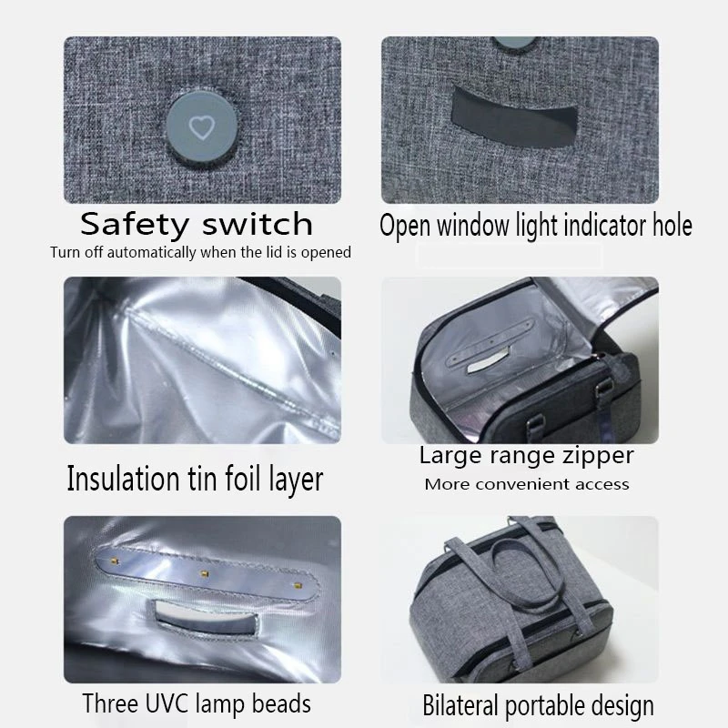 Защита и безопасная конструкция-застегните сумку, нажмите кнопку и четко увидите фиолетовый светильник в прозрачной области в режиме очистки, не вытекнет светильник.
