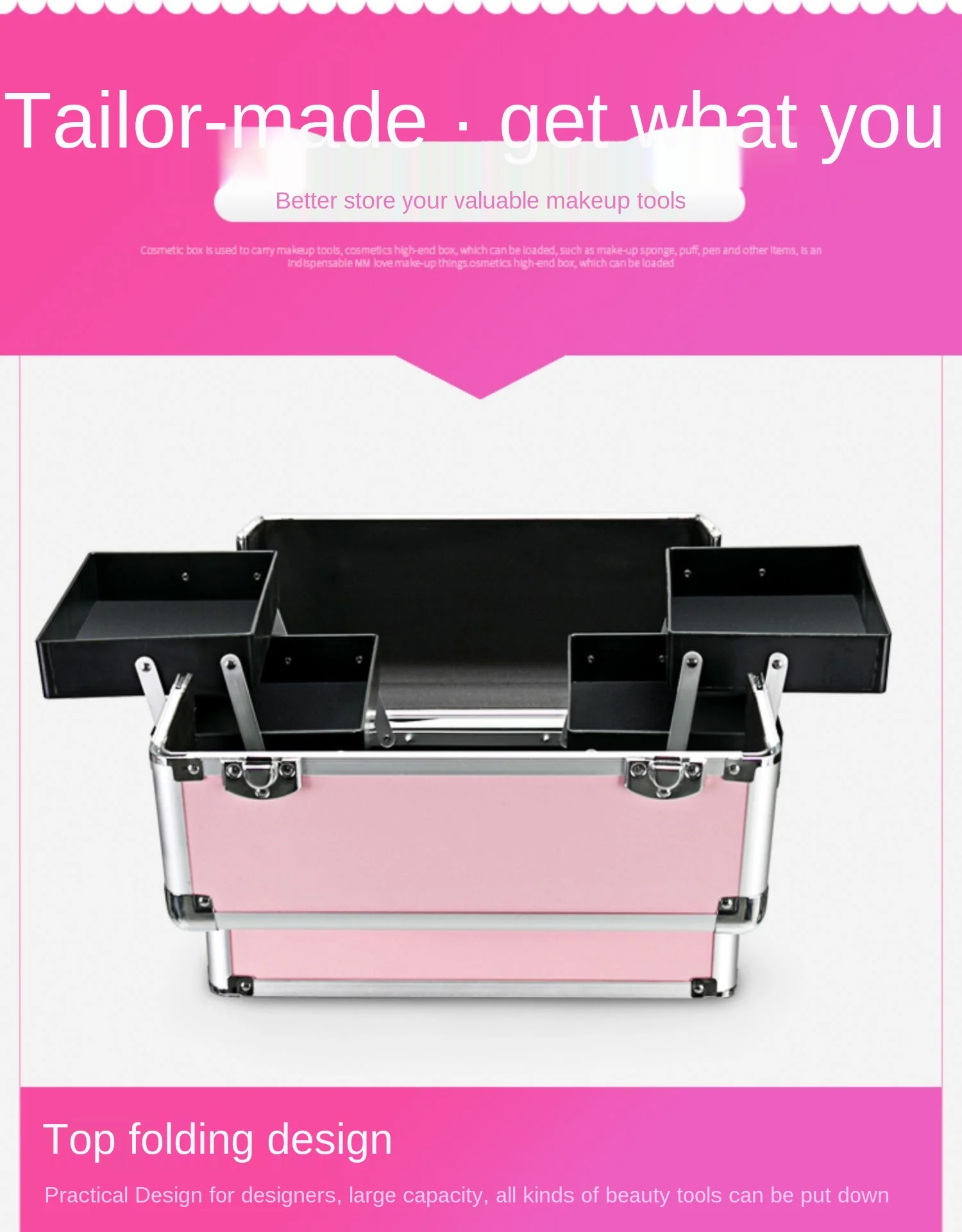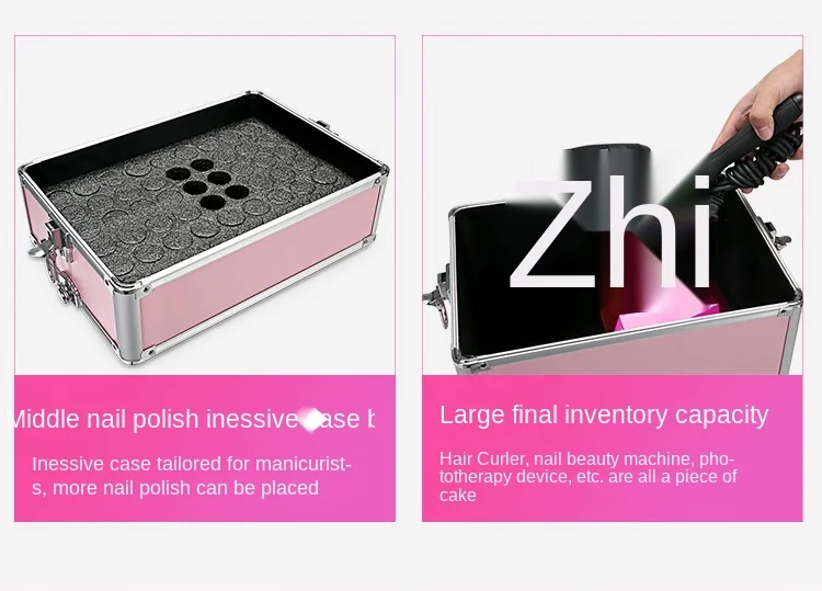 Верхний этаж складывается, свободно закрывается и убирается. Средний слой оснащен губкой, инструмент для полировки ногтей, большой нижний слой, и может быть помещен стержень для завивки. Фен не оказывает давления.