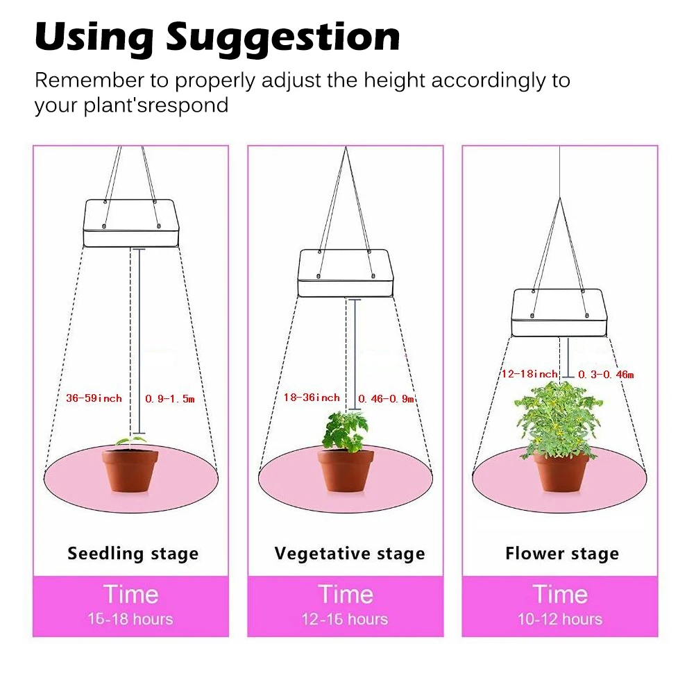 We suggest to hang the light 18"-24" above the plant canopy keep it turned ON for a continuous 16 hours each day.