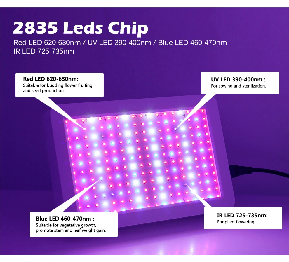This plant growth lamp includes IR and UV chips, the IR & UV chips are look dim, but this is not a defect of the product, they play an important role in the growth and development of plants.