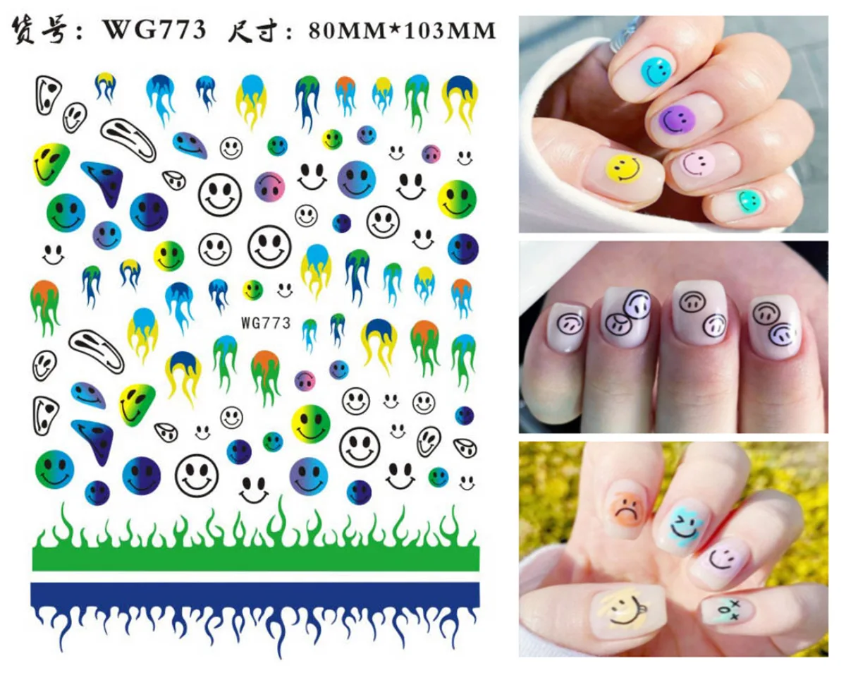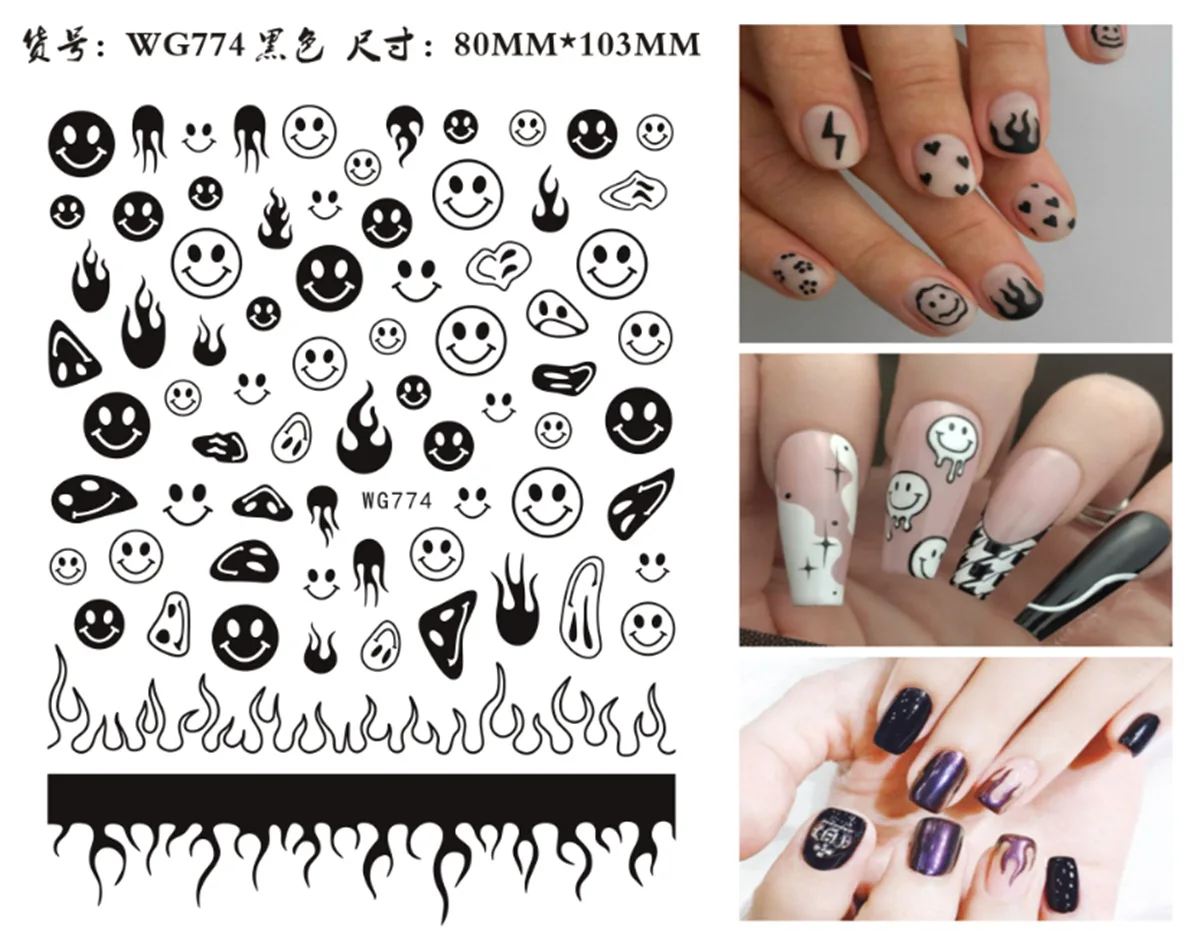 Ультра тонкий стикер для дизайна ногтей 3d лицо улыбка огонь пламя черный белый золотой и серебряный цвета счастливые дети Маникюр Наклейка WG100