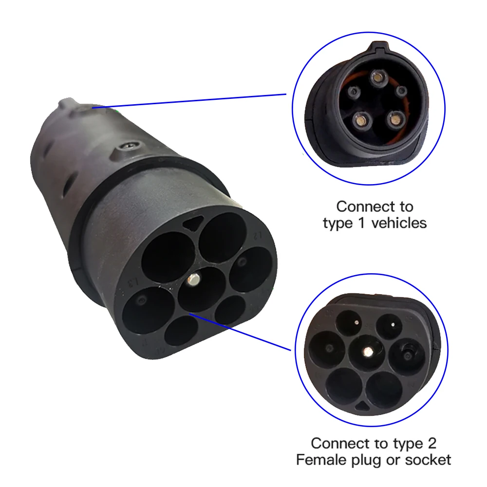 Этот адаптер позволит любому EV, оснащенному адаптером зарядного устройства типа 1 EV, использовать любую EVSE (точку зарядки)-фиксированную или портативную-оснащенную разъемом привязанного типа 2 (IEC 62196).