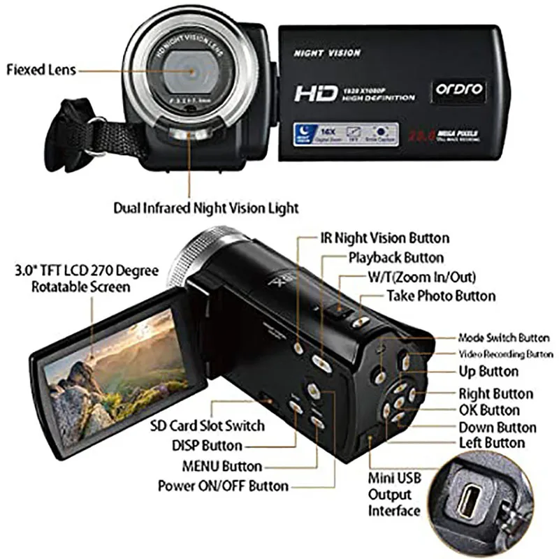 1080P видеокамера: разрешение 1920x1080P (FHD), до 20.0 мегапикселей. 3,0 дюйма TFT-LCD экран (270 градусов вращение). 16x цифровой зум, захват лица, анти-дрожание, встроенный микрофон и динамик, мини USB2.0 и av-выход, дистанционное управление. Мы рекомендуем загружать видео на ваш телевизор или компьютер, чтобы показать лучшие изображения и звук.
