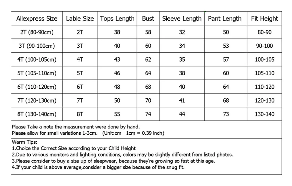 Подходит для трех сезонов: весны, осени и зимы. Это размер пижамы, измеренный на плоской подошве, пожалуйста, купите его в соответствии с размером ребенка. Aliexpress Размер 2T, размер 2T, Длина топа: 38, обхват груди: 58, длина рукава: 32 см, длина брюк: 50 см, Высота посадки: 80-90 см Aliexpress Размеры 3t, этикетки Размеры 3t, топы Длина: 40, обхват груди: 60, рукав Длина: 34 см, штаны Длина: 53 см, рекомендуемый рост: 90-100 см Aliexpress Размер 5T, размер 5T, Длина топа: 46, обхват груди: 64, длина рукава: 38 см, длина брюк: 60 см, Высота посадки: 105-110 см Aliexpress Размер 6T, размер 6T, длина топа: 48, обхват груди: 68, длина рукава: 40 см, длина брюк: 64 см, Высота посадки: 110-120 см Aliexpress Размер 7T, Размер 7T, Длина топа: 50, обхват груди: 70, длина рукава: 41 см, длина брюк: 68 см, Высота посадки: 120-130 см Aliexpress Размер 8T, Размер 8T, Длина топа: 55, обхват груди: 74, длина рукава: 44 см, длина брюк: 73 см, Высота посадки: 130-140 см 1 дюйм = 2,54 см 1 см = 0,39 дюймовПри ручном измерении допускается погрешность в 1-3 см. Теплые советы: В: Являются ли фотографии изделий реальными? Вопрос: Есть ли Прямая поставка