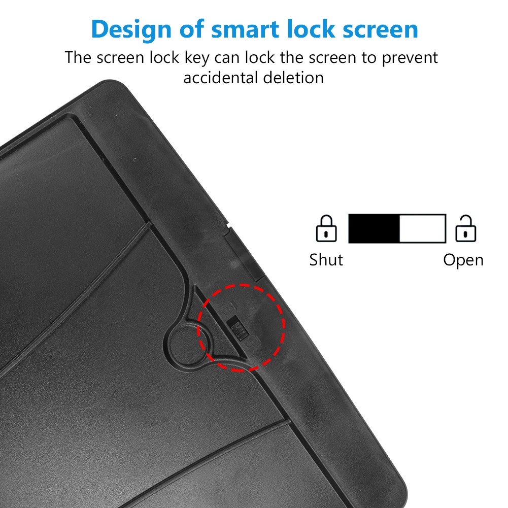 Функция блокировки экрана. Вставьте кнопку блокировки на задней панели для предотвращения случайной очистки, защищает Ваше творение! Нажмите кнопку стирания, чтобы очистить почерк.