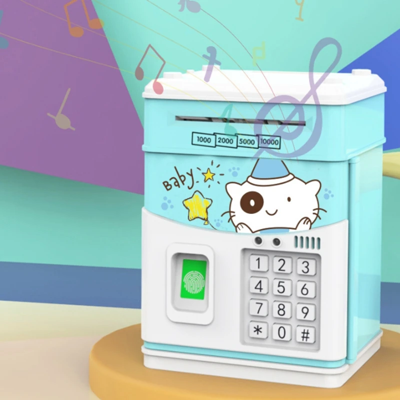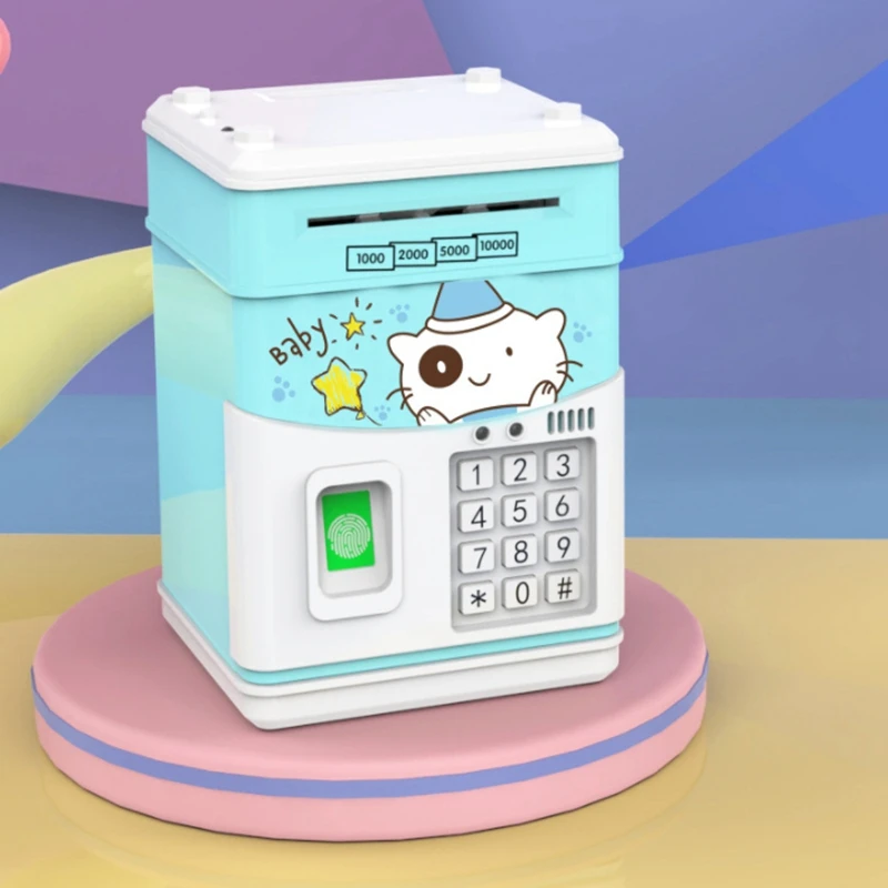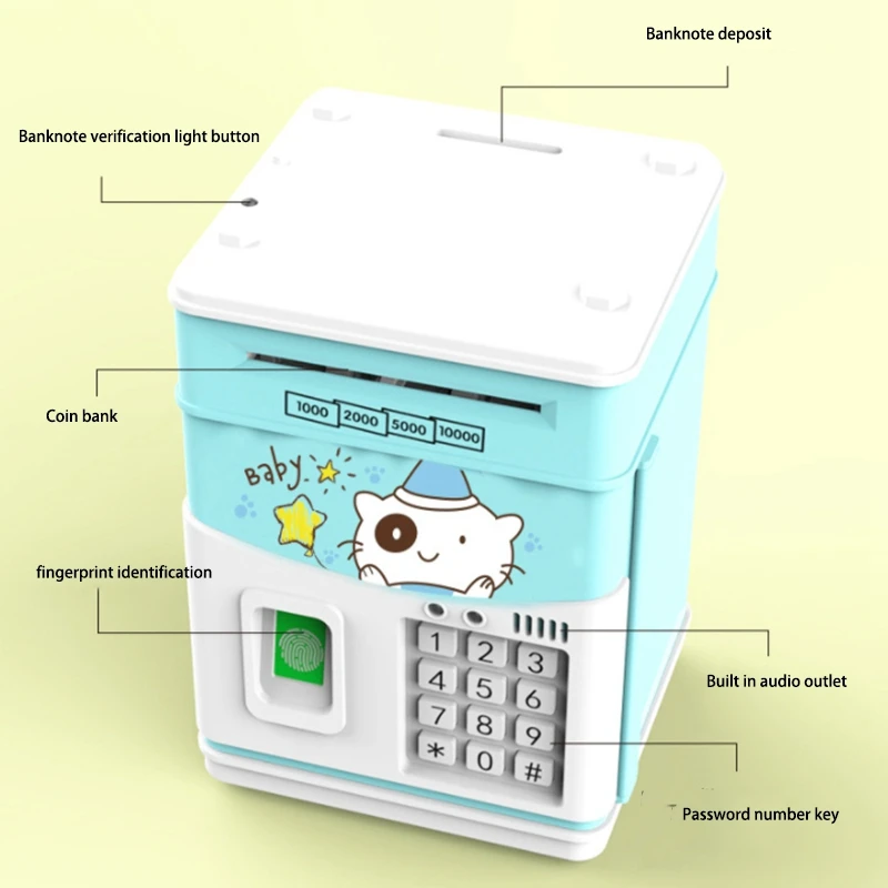 Автоматический рулон денег: Положите бумажные деньги на свиток, его можно свернуть в копилку автоматически. Двойная безопасность: пароль и вид отпечатка пальца. Введите четырехзначный пароль, отпечаток пальца, чтобы открыть дверь. Улучшение безопасности собственности ребенка