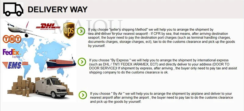 Мы поможем вам организовать доставку международной экспресс-почтой (например, DHL / TNT/ FEDEX /ARAMEX и т. Д.) и напрямую доставить по вашему адресу (от двери до двери)!