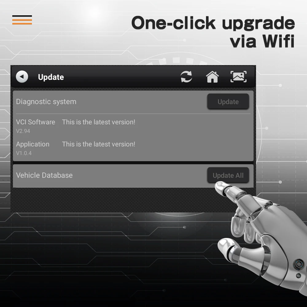 Нет необходимости обновлять на компьютере. Подключив Wi-Fi, он автоматически будет искать последнее обновление programe, просто нажмите update, вы получите последнюю версию (больше моделей автомобилей, исправление ошибок) этого сканера. Вы будете наслаждаться пожизненным обновлением с помощью функции one-key.