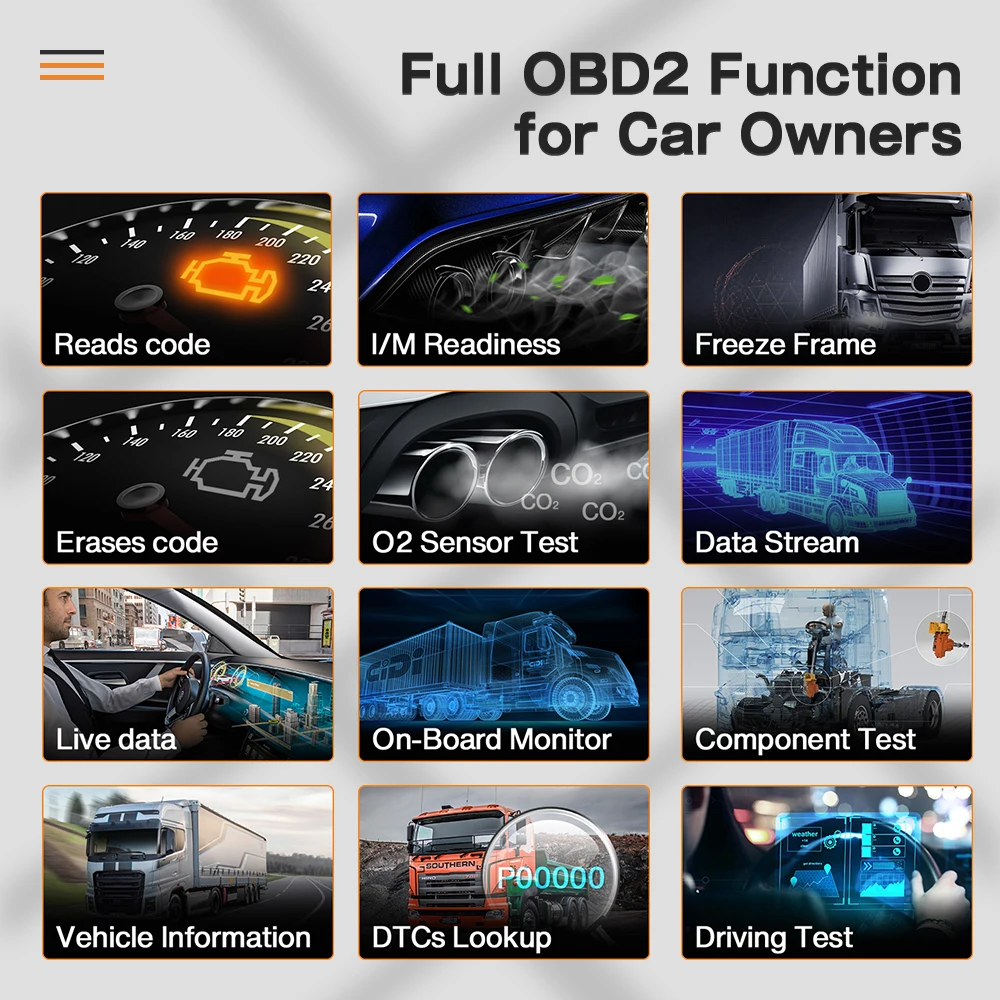 【Полная Диагностика OBDII на двигателе】этот инструмент не только считыватель кода грузовика, но и работает с двигателями OBD2 в качестве автомобильного сканера для всех 10 режимов тестирования OBD2. Считывание/очистка кодов, просмотр данных о замораживании кадра и состояние контроля за готовностью I/M, отображение потока данных в реальном времени и тестовых данных датчика O2 и многое другое.