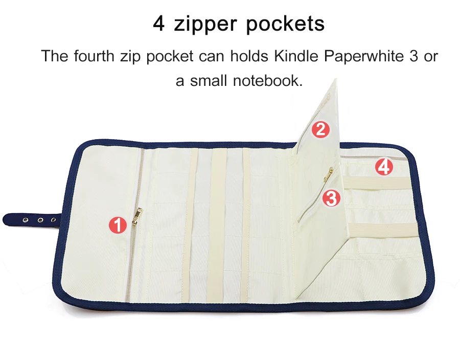 2. Четыре кармана на молнии содержат ценные вещи. Четвертый карман на молнии может держать Kindle Paperwhite3 или 6 дюймов ноутбук.