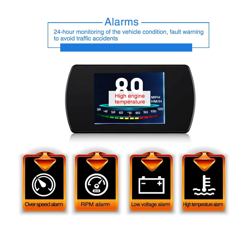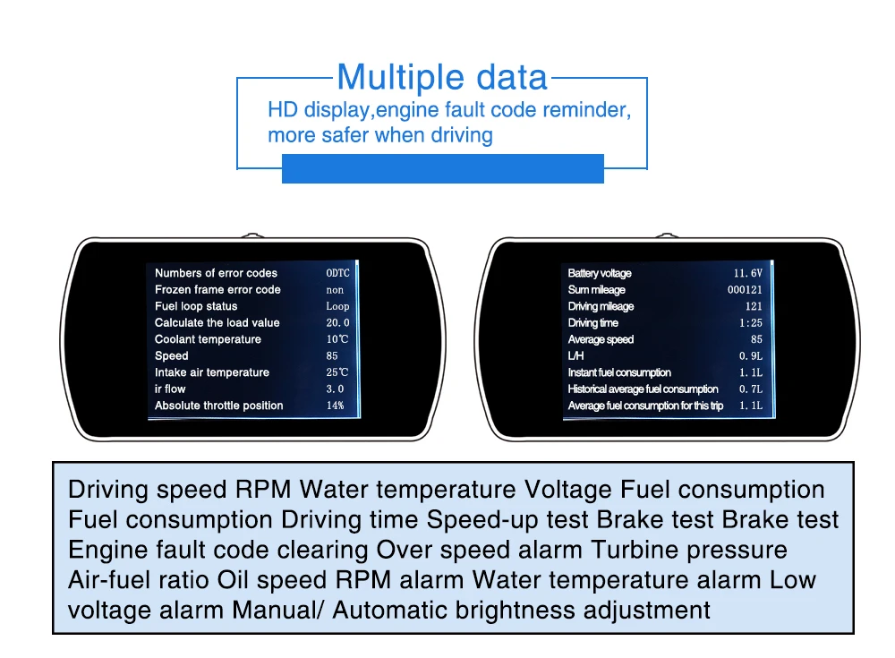 7. Богатое содержание: скорость транспортного средства, об/мин двигателя, температура воды, напряжение, мгновенный расход топлива, средний расход топлива, измерение расстояния вождения, время вождения, сигнал тревоги низкого напряжения, сигнал тревоги высокой температуры воды, сигнализация с превышением скорости, сигнализация с кодом неисправности двигателя, устранение кода неисправности, свободное переключение между километрами и милями.