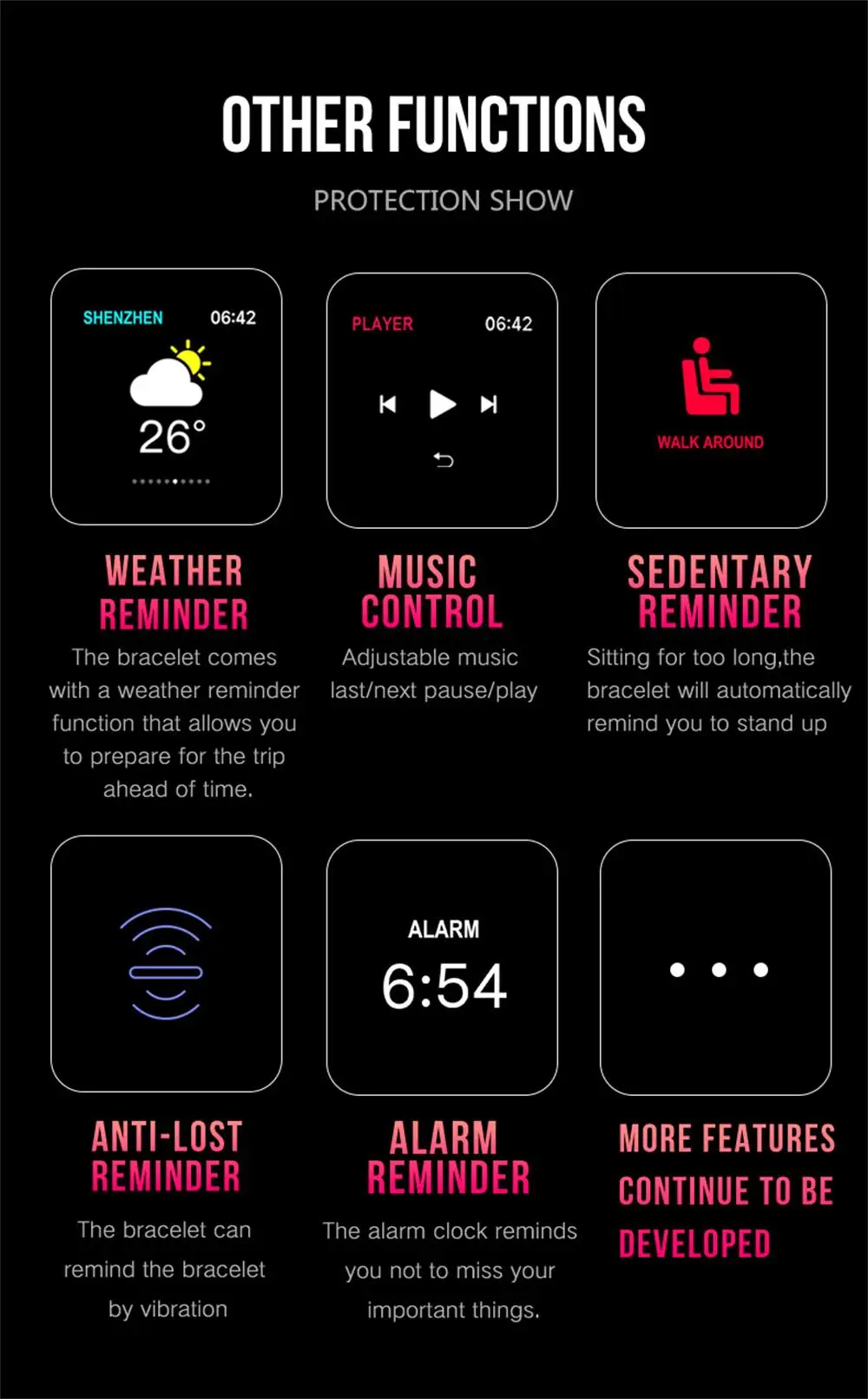 1. Bracelet display function: time display, battery icon display, date display, week display, standard motion function (step, distance, calorie) multi-sport mode (walking, running, cycling, skipping, badminton, basketball) , football, swimming), heart rate, blood pressure detection, blood oxygen detection, sleep time display, screen brightness adjustment, music control.
