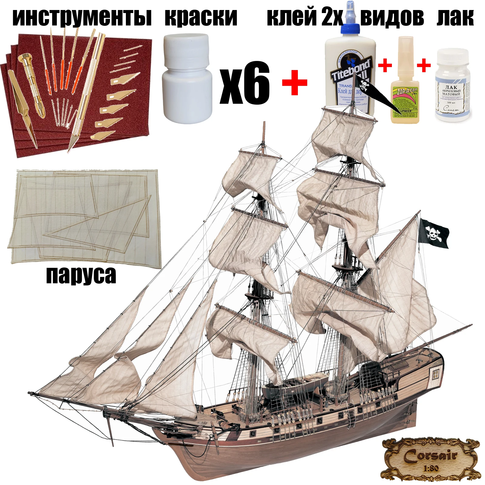 СОДЕРЖИМОЕ НАБОРА МОДЕЛИ КОРАБЛЯИз этого набора испанская фирмы OcCre вы построите копию пиратского корабля Corsair 18 века. Предварительно вырезанные деревянные детали обеспечивают хорошую стыковку, а двойная обшивка сделает корпус безупречным. Модель корабля для сборки имеет обширный набор мелких деталей содержит всё, что потребуется. Там вы найдете блоки и юферсы из самшита, латунные цепи, рымы и нагеля, металлическую шлюпку и 16 латунных пушек на металлических лафетах. Для такелажа даны нити четырех диаметров, готовые паруса, пиратские флаги. Завершает модель корабля деревянная подставка. Четкие чертежи и инструкция в фотографиях устранят все непонятности при сборке.2. Испанская фирма OcCre в комплекте даёт готовые паруса, но они плохого качества, которые портят весь вид хорошей модели. Это вынудило нас взяться за разработку технологии потокового изготовления парусов для моделей парусников. После различных экспериментов мы остановились на лазерной гравировке по ткани. Процесс оказался технологичный, результатом мы довольны, паруса получаются двухсторонние, очень реалистичные, а применение перкали (специальная промышленная ткань) сделало их масштабными. Паруса даны уже вырезанными, остается только пришить лик-трос и сделать петельки (кренгельсы) по углам. Расположение нитей на ткани параллельно швам между полотнищами. Полный комплект парусов для модели парусника Corsair включает в себя десять парусов.
