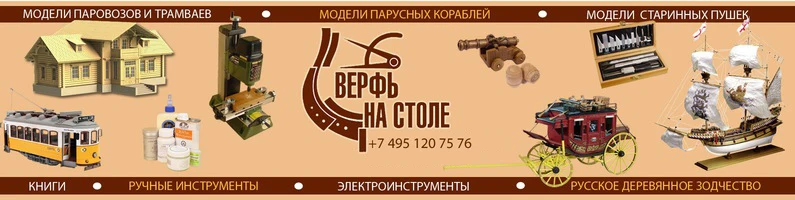 "Верфь на столе" предлагает самый большой в Восточной Европе ассортимент товаров для судомоделизма, для самостоятельного изготовления моделей парусников, кораблей, лодок, паровозов, трамваев, самолетов, деревянного и керамического зодчества, отдельные элементы и материалы.