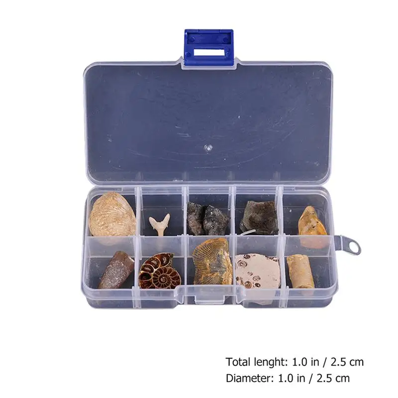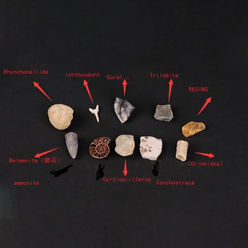 -В том числе 10 древних окаменелостей: морская Окаменелость, трилобит, ичтойодон, аммолит, копалевый янтарь, граптолит, рифнчонеллида, кончостракан, башни кораллы, спирифер.